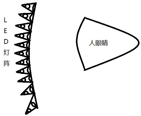 為了解決由于距離近無(wú)法看清圖像的問題,我利用用凸透鏡把每個(gè)LED燈的光線都由發(fā)散光聚焦,但并不是聚焦為平行光,而是仍略有發(fā)散,使人眼能夠看清圖像。這樣做的目的是防止不同使用者戴眼鏡位置不同而可能發(fā)生的看不清圖像的問題。如圖: