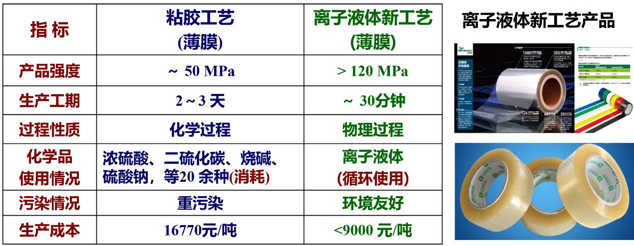 以前纖維素制膜工藝污染很大,中國逐漸在關(guān)停。而我們的離子液體工藝是物理溶解,基本沒有污染。原來工藝需要三天時(shí)間,現(xiàn)在三十分鐘就做出來了(圖8)。在車間里面都聞不到氣味,火都點(diǎn)不著,非常安全。其中溶劑是我們的專利,包括后面的溶劑回收,溶劑是可以回收再反復(fù)利用的。用我們這個(gè)工藝與企業(yè)合作建立了生產(chǎn)線,2019年基本已經(jīng)建成了,今年11月底試車。生產(chǎn)的產(chǎn)品推薦在快遞物流上使用,特別是用低成本秸稈做的膠帶,有很好的應(yīng)用前景。