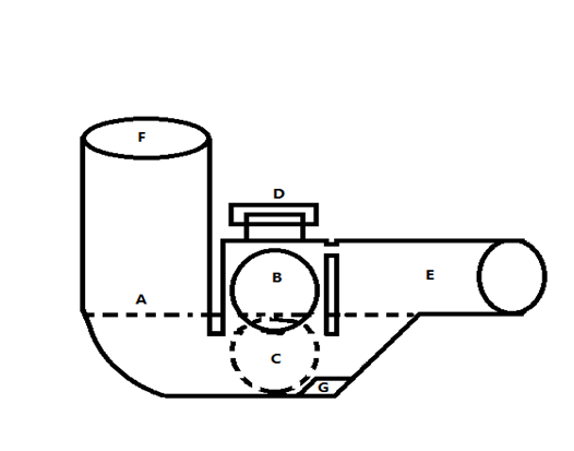 排水管的設計(如圖):本設計是在U型管道的基礎上增加固體阻斷機構(球形、圓柱形等多種形體),當U型管道中填充一定量的水時,機構內的阻斷球就會在浮力的作用下,處于完全開放的狀態(tài),當U型管道內的水因得不到及時補充而氣化,這時,B球體在重力作用下,隨著管內水位下降而下落。在管道底部、球體下落方向增設斜面,增加球體下落壓力,增加球體密封效果。當管道內補充一定的水量時,球體的水的浮力作用下,上浮到B區(qū),保持管道通暢。從而達到有效阻止有害物質回流的目的。