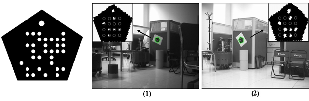 圖6 面向機(jī)器人視覺系統(tǒng)的MR-二維碼,左圖是MR-二維碼,右圖(1)和(2)是MR-二維碼在不同光照下的識別效果