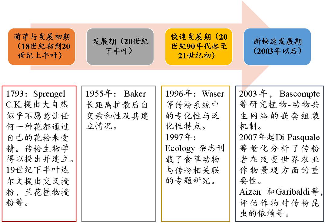 由于傳粉昆蟲的重要性以及目前所面臨的危機(jī)已經(jīng)引起科學(xué)家和民眾的廣泛關(guān)注。諸多地區(qū)級(jí)、國家級(jí)乃至全球級(jí)別的傳粉研究已經(jīng)取得了階段性的成果。就全球范圍來說,傳粉昆蟲的研究主要包括四個(gè)時(shí)期,分別為:1)萌芽與發(fā)展初期(18世紀(jì)初到20世紀(jì)上半葉);2)發(fā)展期(20世紀(jì)下半葉);3)快速發(fā)展期(20世紀(jì)90年代起至21世紀(jì)初);4)新快速發(fā)展期(2003年以后)。