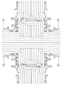 開放型人行道115進(jìn)入路口前讓位于電動車道。縱向電動車道301人行道302位于兩端路面橋上的橫向掉頭車道與縱向高架車道的中間,兩端分別穿越右轉(zhuǎn)彎車道(高度以電動車行人順利通過為宜)。人行道出入口107、108跨越電動車道,人行道出入口107-108之間(橫向)為地下通道穿越各縱向車道(高度以電動車行人順利通過為宜)。電動車道出入口109-110之間(橫向)為地下通道,穿越人行道入口107、108和各縱向車道(高度以電動車行人順利通過為宜)。
