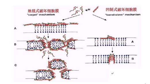 防御素抗菌的作用機(jī)理,目前有兩種不同的抗菌作用機(jī)理被提出,一種是獨(dú)立膜機(jī)制,另一種是防御素結(jié)合細(xì)胞內(nèi)復(fù)合物的機(jī)制。獨(dú)立膜機(jī)制的觀點(diǎn)認(rèn)為, 帶正電荷的防御素與帶負(fù)電荷的細(xì)菌細(xì)胞膜相互吸引,并相互結(jié)合,從而破壞了磷脂雙分子層的完整性,引起靶細(xì)胞膜出現(xiàn)裂隙。可分為三個(gè)階段:(1)由靜電吸引。防御素與靶細(xì)胞膜結(jié)合。防御素帶正電荷,可通過(guò)靜電作用與帶負(fù)電荷的細(xì)菌膜脂層結(jié)合;(2)通道形成。帶正電荷的防御素分子或其多聚體則與細(xì)菌質(zhì)膜上帶負(fù)電荷的磷脂頭部和水分子相互作用,顯著地增加生物膜的通透性。防御素作用于膜上形成穩(wěn)定的多個(gè)通道;(3)內(nèi)容物外泄。通道形成后,防御素進(jìn)入細(xì)胞內(nèi)的同時(shí),其他胞外分子也伴隨進(jìn)入(如肽、蛋白質(zhì)或無(wú)機(jī)離子),而靶細(xì)胞的重要物質(zhì)(如鹽離子和大分子)滲出,細(xì)胞膜的通透性及細(xì)胞能量狀態(tài)受到了破壞,導(dǎo)致細(xì)胞膜去極化,呼吸作用受到抑制以及細(xì)胞ATP含量下降, 離子和大分子物質(zhì)通過(guò)細(xì)菌的細(xì)胞膜, 最終導(dǎo)致靶細(xì)胞死亡。