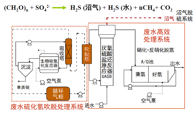 在高硫酸鹽廢水處理集成系統(tǒng)中,首先硫化氫先經(jīng)過吹脫處理,降低硫化氫對后續(xù)反應(yīng)中對厭氧反應(yīng)的抑制。經(jīng)吹脫過的廢水進(jìn)入?yún)捬趿蛩猁}還原反應(yīng)器,進(jìn)行一系列后續(xù)高效的硝化與反硝化處理,最終出水達(dá)標(biāo)排放(圖1-9)。