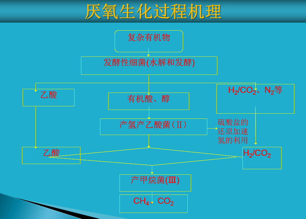 硫酸鹽還原階段;含氮/硫有機廢水首先進(jìn)行硫酸鹽還原反應(yīng),在硫酸鹽還原菌和產(chǎn)甲烷菌的作用下,完成硫酸鹽還原和大部分COD的去除;