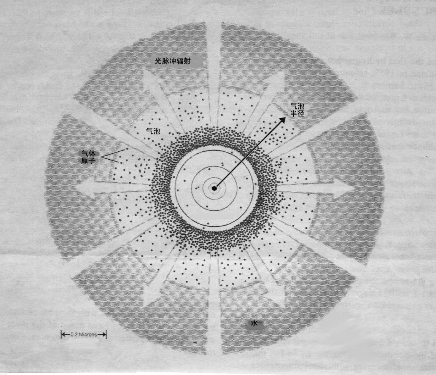 氣泡聲致發(fā)光如圖所示。氣泡外面是水。這個(gè)氣泡在超聲波的作用下,一會(huì)變大一會(huì)變小,氣泡里的小黑點(diǎn)代表氣體里的分子和原子。圖中標(biāo)尺的長(zhǎng)度是0.2微米。氣泡在塌縮到一定程度時(shí)就發(fā)出光。